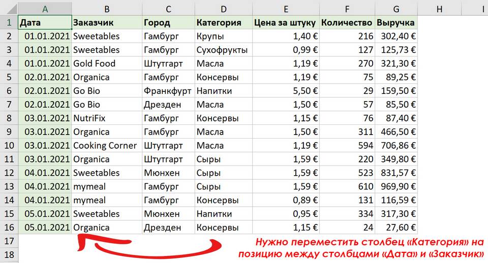 Перемещение | Выделить столбец → перетащить за границу |